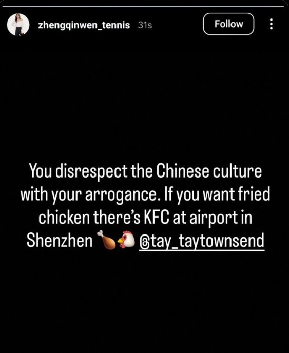 Amid the controversy, World No. 8 Zheng Qinwen responded firmly to Townsend’s remarks. In a social media post, Zheng said Townsend’s reaction reflected “arrogance” and insulted Chinese culture.